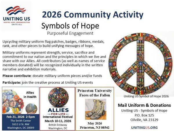 Join an upcoming Uniting US event or send your uniform pins, patches, medals, and support via mail. Uniting US is currently accepting inquires for communities, businesses, and other organizations interested in hosting a Symbols of Hope collaborative work.